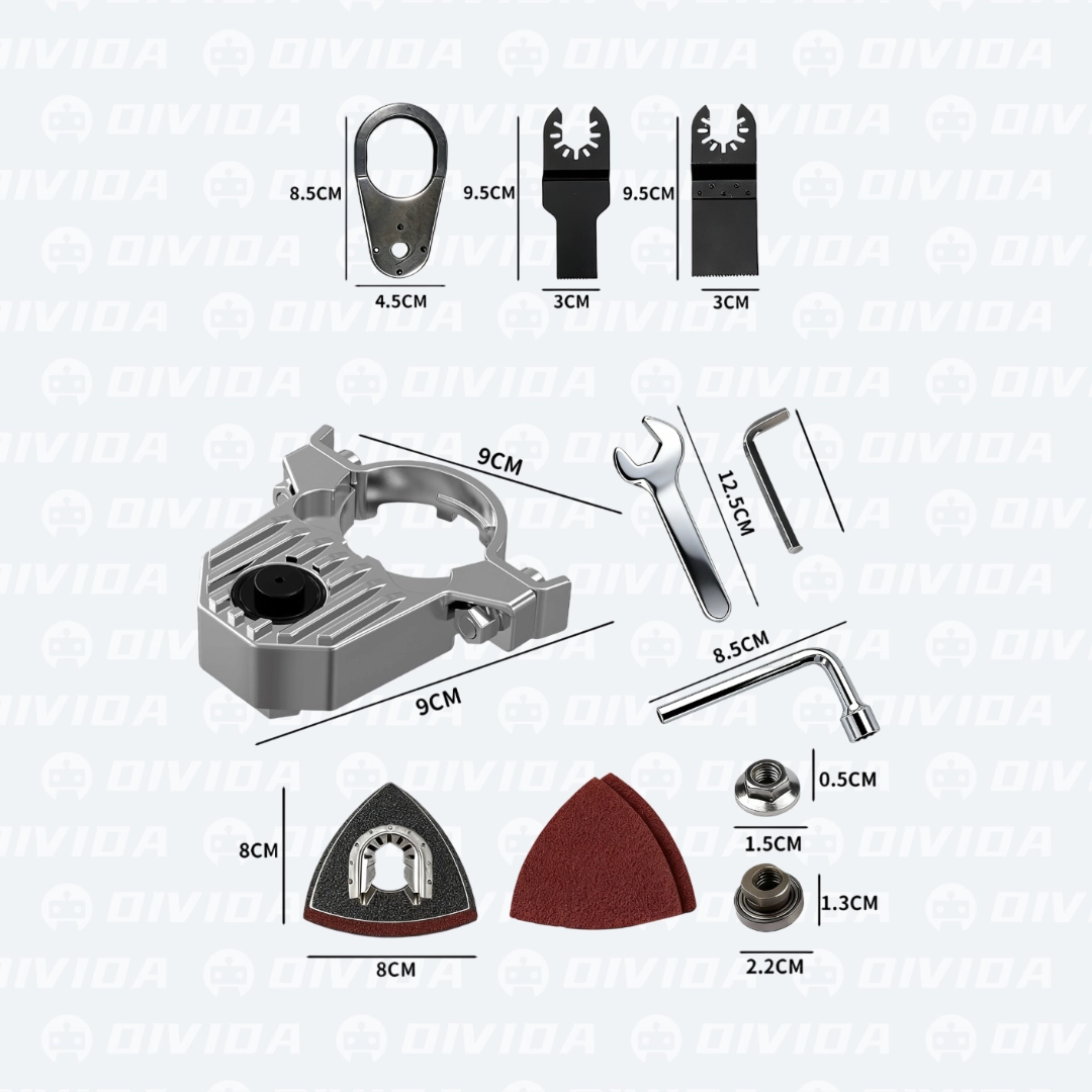 Kit completo de acessórios para ampliar as funções da sua multiferramenta. Ideal para cortes, lixamentos, raspagens e ajustes em madeira, metal, plástico e outros materiais.